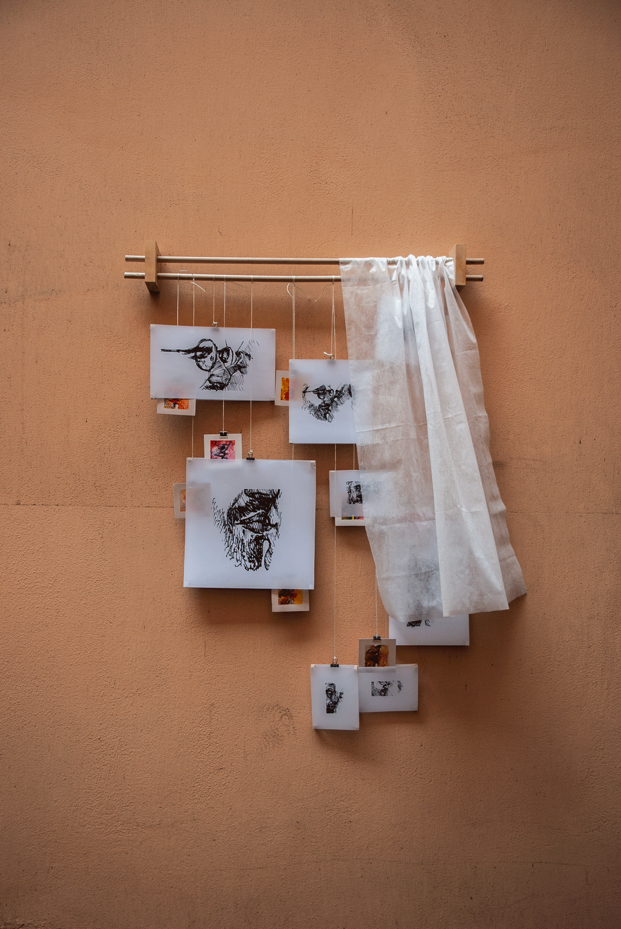 Hanging drawings, wind, flying curtain and threads